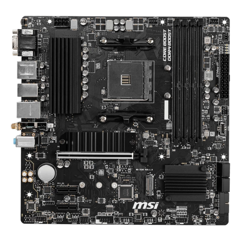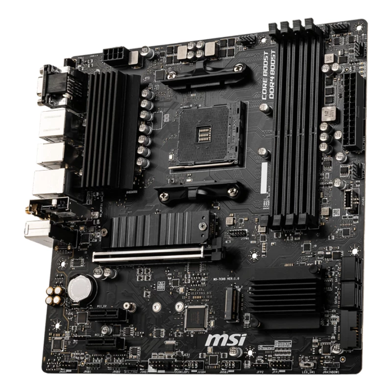 MSI B550M PRO-VDH WIFI. Fabricante de procesador: AMD, Socket de procesador: Enchufe AM4, Procesador compatible: AMD Ryzen 3000 Series. tipos de memoria compatibles: DDR4-SDRAM, Memoria interna máxima: 128 GB, Tipo de ranuras de memoria: DIMM. Interfaces de disco de almacenamiento soportados: SATA III, Tipos de unidades de almacenamiento admitidas: HDD & SSD, Niveles RAID: 0, 1, 10. Memoria máxima de adaptador de gráficos: 16000 MB, Máxima resolución: 4096 x 2160 Pixeles. Tipo de interfaz ethernet: Gigabit Ethernet, Controlador LAN: Realtek 8111HN, Máximo estándar Wi-Fi: Wi-Fi 5 (802.11ac)