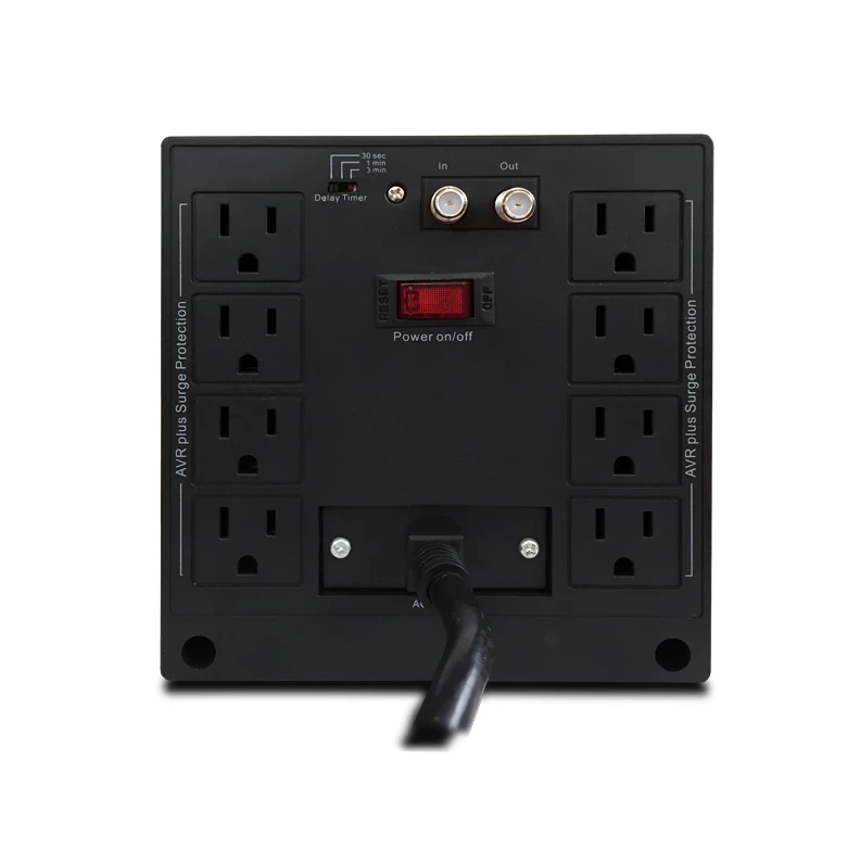 CDP R-AVR2408. Voltaje nominal de entrada: 95-150 V, Frecuencia de entrada: 50/60 Hz, Máxima corriente de entrada por fase: 15 A. Voltaje de salida: 120 V, Frecuencia de salida: 50/60 Hz, Capacidad de potencia de salida (VA): 2.4 kVA. Cantidad de salidas AC: 8 salidas AC, Tipo de salida AC: NEMA 5–15R. Índice de aumento de energía: 525 J. Ancho: 150 mm, Profundidad: 250 mm, Altura: 157 mm