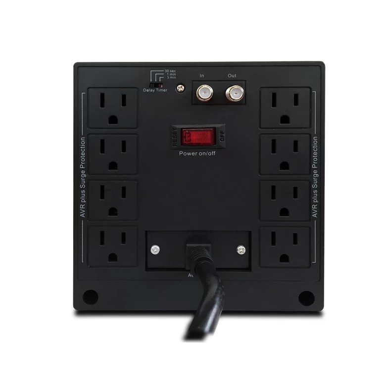 CDP R-AVR3008. Voltaje nominal de entrada: 95-150 V, Frecuencia de entrada: 50/60 Hz, Máxima corriente de entrada por fase: 20 A. Voltaje de salida: 120 V, Frecuencia de salida: 50/60 Hz, Capacidad de potencia de salida (VA): 3 kVA. Cantidad de salidas AC: 8 salidas AC, Tipo de salida AC: NEMA 5–15R. Índice de aumento de energía: 525 J. Ancho: 150 mm, Profundidad: 250 mm, Altura: 157 mm