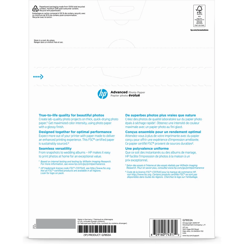 Imprima hermosas fotografías que amará tener y compartir. Fotografías de gran fidelidad con colores vivos e intensos y un acabado fantástico gracias a este papel con certificación FSC[3]. Sus impresiones resistentes a la decoloración[2] tienen un acabado satinado que le permite obtener fotos brillantes.
