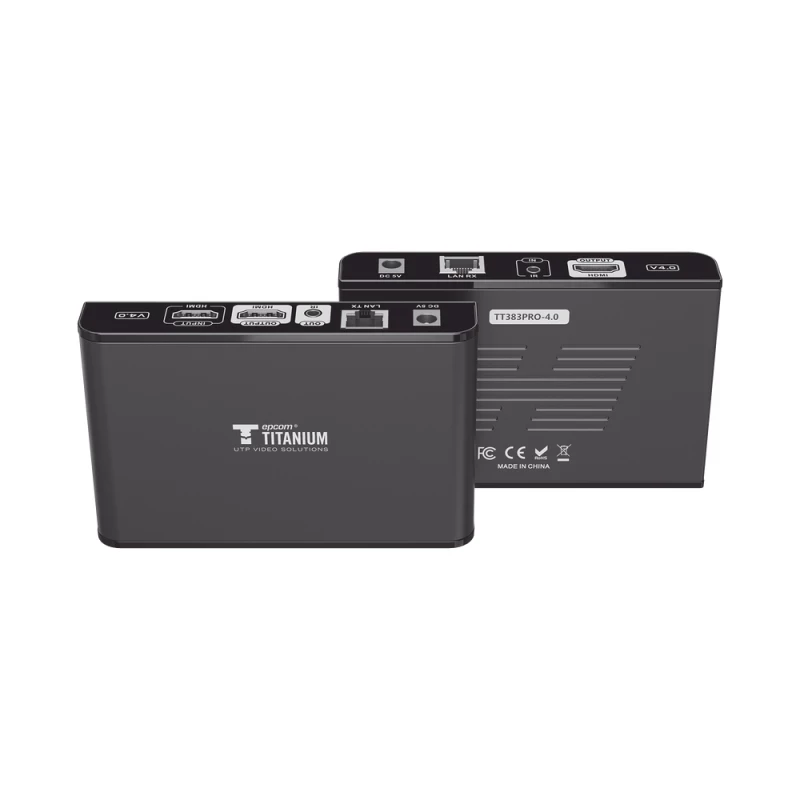 Epcom TT-383-PRO-4.0. Tipo: Transmisor y receptor AV, Máxima resolución: 1920 x 1080 Pixeles, Tipos de cable soportados: Cat5, Cat5e, Cat6. Tecnología de conectividad: Alámbrico. Voltaje de operación: 5 V, Corriente de entrada: 1 A. Dimensiones de receptor (Ancho x Profundidad x Altura): 130 x 84 x 23.2 mm, Peso del receptor: 200 g, Dimensiones del transmisor (ancho x largo x alto): 130 x 84 x 23.2 mm