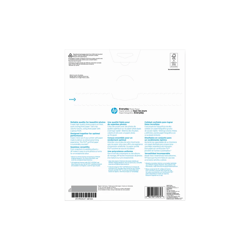 HP Everyday Photo Paper, Glossy, 52 lb, 8.5 x 11 in. (216 x 279 mm), 50 sheets. Tipo final: Brillo, Peso de media: 200 g/m², Color del producto: Blanco. Peso: 610 g. Peso del paquete: 700 g. Número de cajas de cartón por tarima: 140 pieza(s), Cantidad por tarima: 700 pieza(s). Dimensiones (Ancho x Profundidad x Altura): 238 x 14 x 298 mm, Hojas de medios por paquete: 50 hojas, Dimensiones de papel: 216mm x 279mm