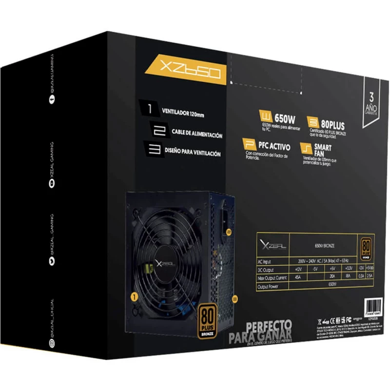 XZEAL XZ650. Potencia total: 650 W, Voltaje de entrada AC: 200 - 240 V, Frecuencia de entrada AC: 47 - 63 Hz. Alimentador de energía para tarjeta madre: 20+4 pin ATX. Utilizar con: PC, Factor de forma de fuente de alimentación (PSU): ATX, Certificación 80 PLUS: 80 PLUS Bronze. Color del producto: Negro, Tipo de enfriamiento: Activo, Diámetro de ventilador: 12 cm. Cables incluidos: Corriente alterna