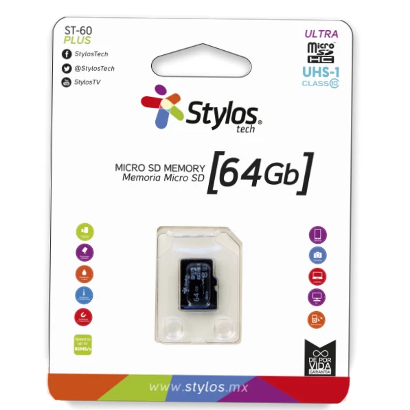 Stylos STMSDS4B. Capacidad: 64 GB, Tipo de tarjeta flash: MicroSDHC, Clase de memoria flash: Clase 10, Tipo de memoria interna: UHS-I, Velocidad de lectura: 25 MB/s, Velocidad de escritura: 14 MB/s. Color del producto: Negro