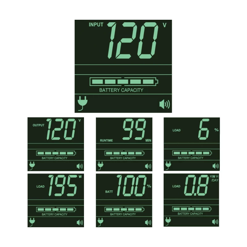 La gran pantalla LCD indica diversas condiciones de funcionamiento del UPS, como voltaje, autonomía, carga, batería y modo de operación. El panel de control gira para permitir configuraciones para instalación en rack y torre. Una alarma acústica indica la perdida de energía de la red pública, sobrecarga o batería baja