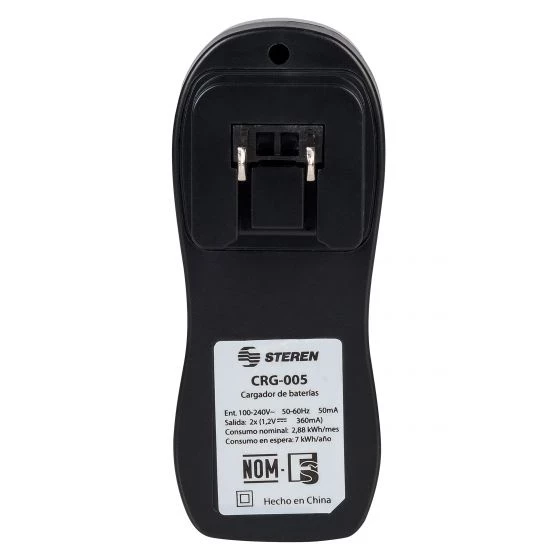 Steren CRG-005. Adecuado para: Batería doméstica, Tipo de alimentación: Corriente alterna, Tecnología de baterías compatibles: Níquel-metal hidruro (NiMH). Color del producto: Negro, Gris. Voltaje de entrada: 100 - 240 V, Frecuencia de entrada: 50/60 Hz, Voltaje de salida: 1.2 V. Tamaño de la baterí: AAA, Tamaño de batería 2: AAA, Capacidad de batería: 1100 mAh. Cantidad por paquete: 1 pieza(s)