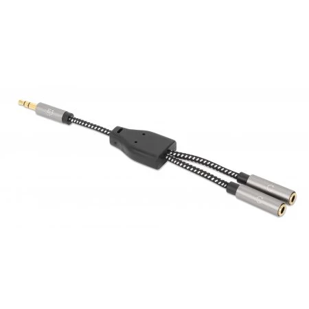 Manhattan Adaptador de Auriculares en “Y” de un Plug a 2 salidas 3.5 mm, 3,5mm, Macho, 2 x 3.5mm, Hembra, 0.15 m, Negro, Plata