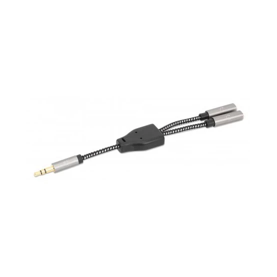 Manhattan Adaptador de Auriculares en “Y” de un Plug a 2 salidas 3.5 mm. Conector 1: 3,5mm, Género del conector 1: Macho, Conector 2: 2 x 3.5mm, Género del conector 2: Hembra, Material del cable: Cobre, Contactos del conector chapado: Oro, AWG calibre del cable: 28, Longitud de cable: 0.15 m, Color del producto: Negro, Plata