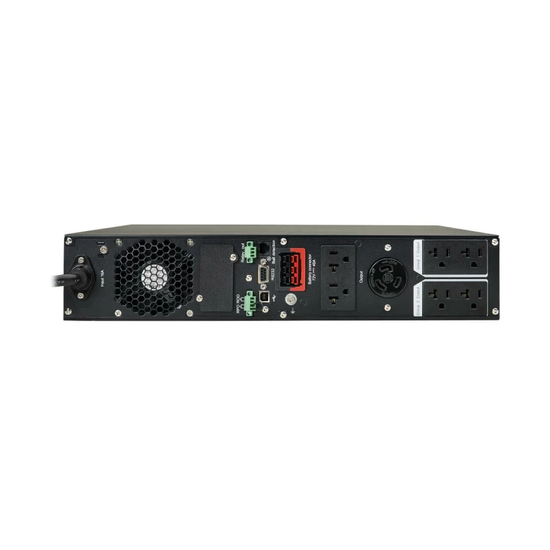 Una toma L5-20R y seis tomas gestionadas 5-20R proporcionan a los equipos conectados una salida de corriente alterna de onda sinusoidal pura y le permiten gestionar el consumo de energía hasta el nivel del grupo de tomas. La energía suministrada por estas tomas se filtra para proteger el equipo conectado contra sobretensiones dañinas y ruido en la línea. Cuatro tomas 5-20R se dividen equitativamente en dos bancos de carga programables que le permiten desconectar cargas no críticas para ampliar la autonomía de las cargas críticas. Un ventilador de enfriamiento ayuda a proteger el equipo contra sobrecalentamiento.