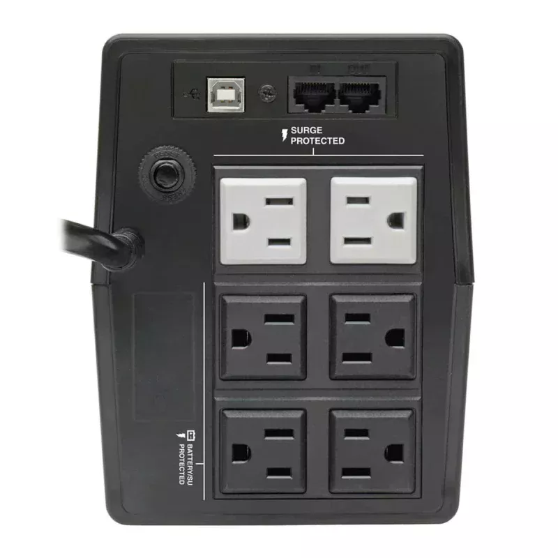 Tripp Lite OMNI700LCDT UPS Interactivo de 700VA 350W con 6 Tomacorrientes - AVR, 120V, 50Hz / 60Hz, LCD, USB, Torre. Topología UPS: Línea interactiva, Capacidad de potencia de salida (VA): 0.7 kVA, Potencia de salida: 350 W. Tipo de salida AC: NEMA 5-15R, Conector: NEMA 5-15P, Cantidad de salidas AC: 6 salidas AC. Tiempo típico de respaldo a carga completa: 3 min, Tiempo típico de respaldo a media carga: 10 min, Tiempo de recarga de la batería (90%): 8 h. Factor de forma: Tower, Color del producto: Negro, Material de la cubierta: Acrilonitrilo butadieno estireno (ABS). Certificados de cumplimiento: RoHS, Certificación: UL1778: 2014 5th EDITION; CAN/CSA-C22.2 NO. 107.3:2014 3rd EDITION