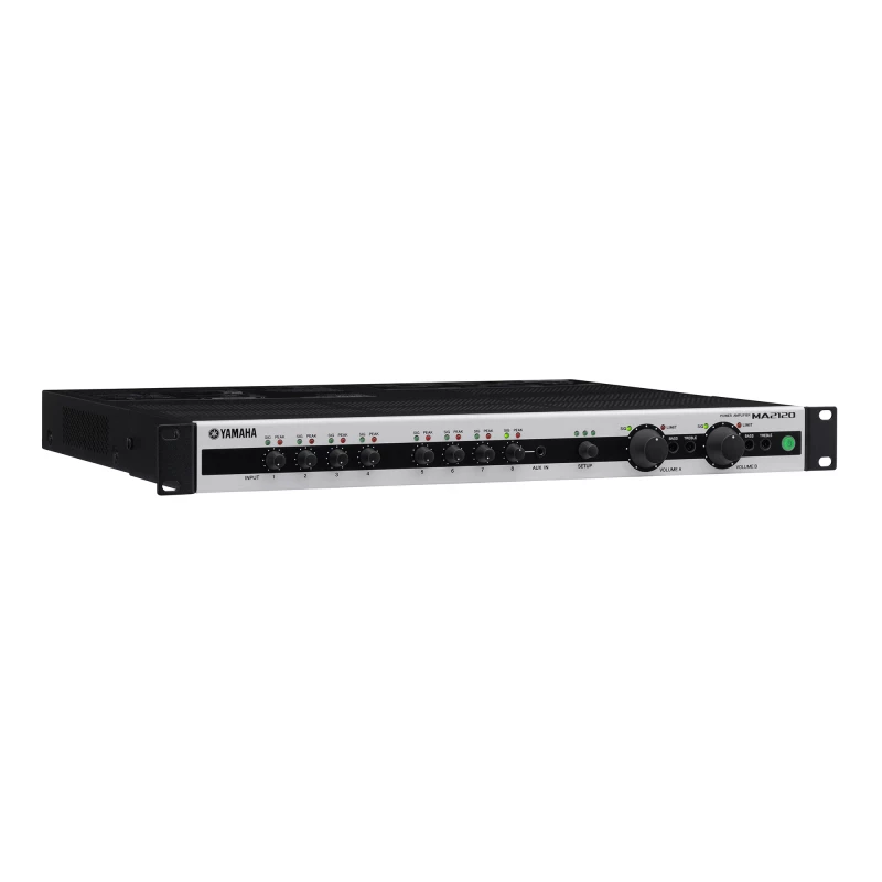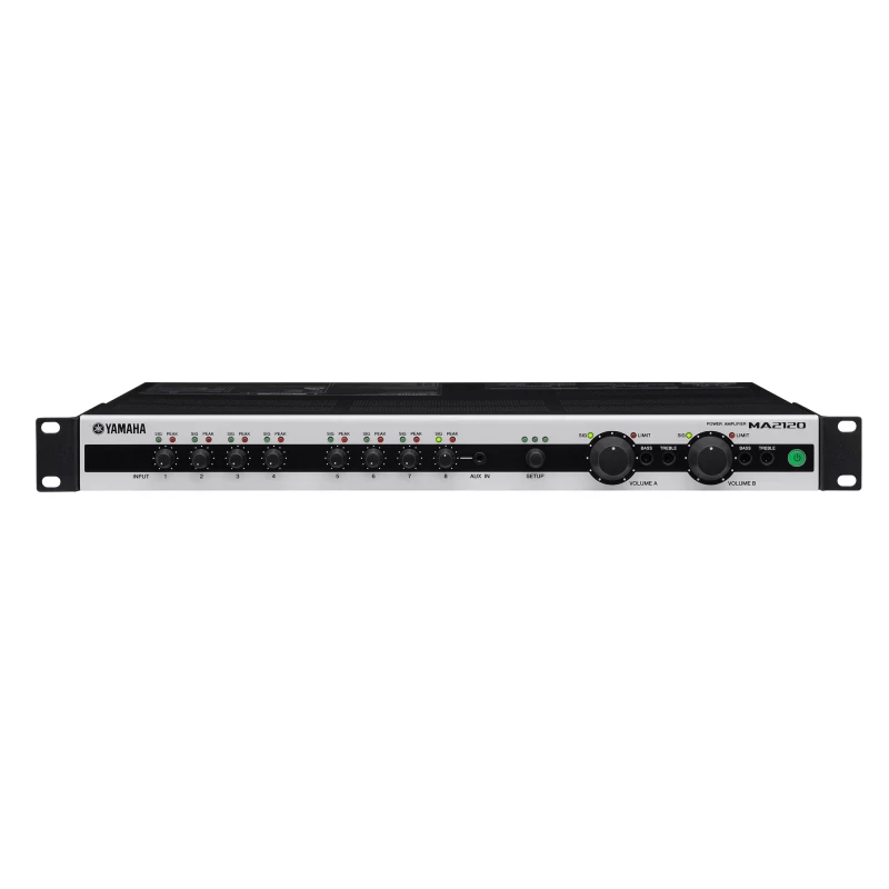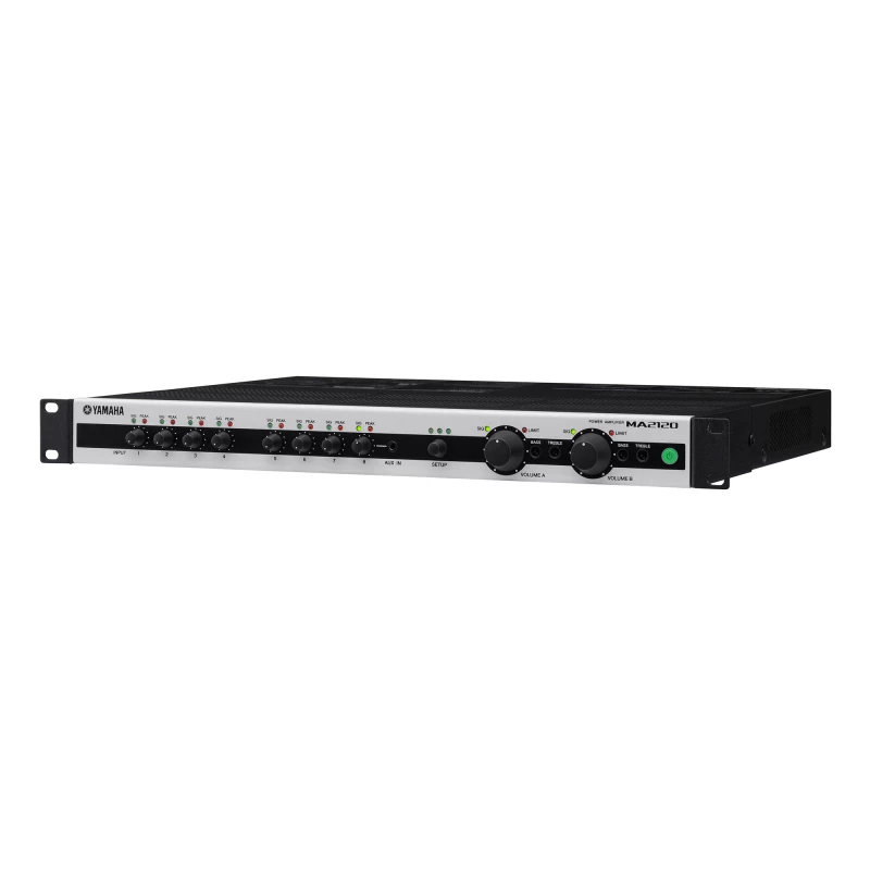 Yamaha MA2120. Amplificador de clase: D, THD, distorsión armónica total: 0.2%, Salida de potencia RMS por canal (4 Ohmios): 120 W. Tipo de conectividad de bocina: Euroblock. Voltaje de entrada AC: 100, 120, 230-240 V, Frecuencia de entrada AC: 50 - 60 Hz, Consumo energético: 60 W. Ancho: 480 mm, Profundidad: 379 mm, Altura: 45 mm