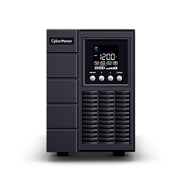 CyberPower OLS2000A. Topología UPS: Doble conversión (en línea), Capacidad de potencia de salida (VA): 2 kVA, Potencia de salida: 1800 W. Tipo de salida AC: NEMA 5–20P, NEMA L5-20R, Conector: Acoplador C20, Cantidad de salidas AC: 4 salidas AC. Voltaje de la pila: 48 V, Tiempo típico de respaldo a carga completa: 4 min, Tiempo típico de respaldo a media carga: 12 min. Factor de forma: Tower, Color del producto: Negro, Longitud de cable: 1.5 m. Ancho: 151 mm, Profundidad: 394 mm, Altura: 225 mm