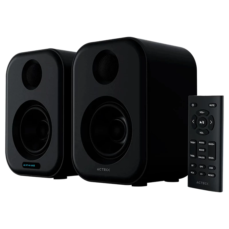 Acteck BS650. Uso recomendado: PC. Canales de salida de audio: 2.0 canales. Tecnología de conectividad: Inalámbrico y alámbrico. Potencia estimada RMS: 50 W, Rango de frecuencia: 45 - 20000 Hz, Impedancia: 8 Ohmio. Operado remotamente, Color del producto: Negro