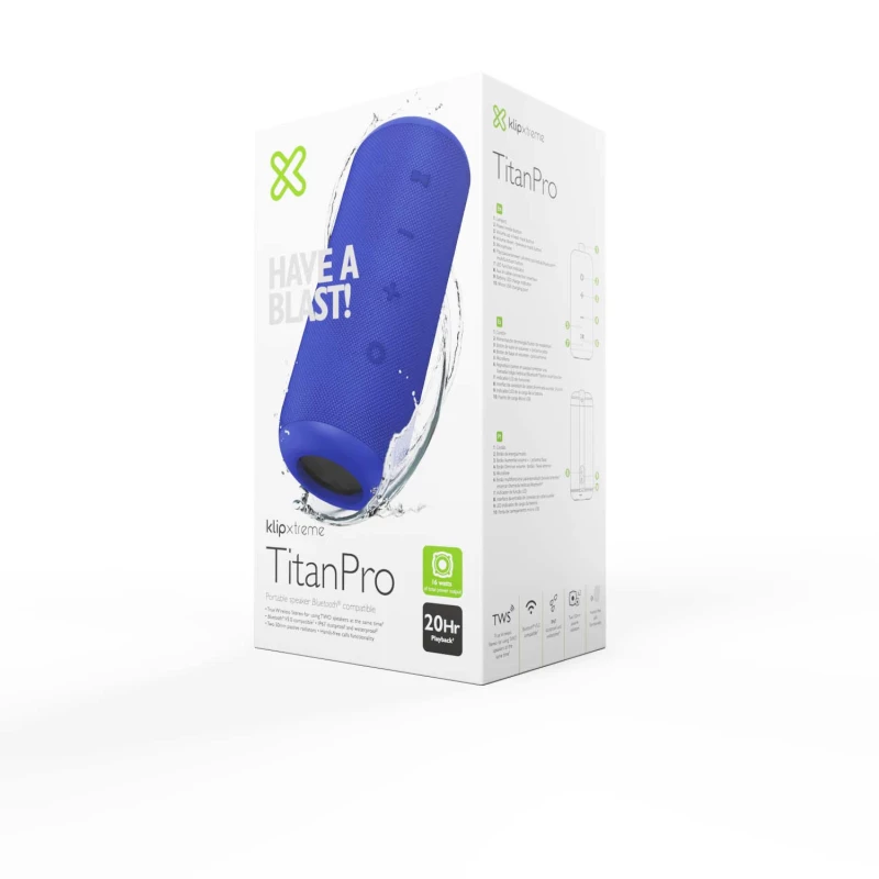 Klip Xtreme TitanPro. Diámetro del controlador: 5 cm. Potencia estimada RMS: 16 W, Rango de frecuencia: 80 - 16000 Hz, Impedancia: 3 Ohmio. Tecnología de conectividad: Inalámbrico y alámbrico, Alcance de frecuencia: 2.402 - 2.48 GHz, alcance Bluetooth: 9.7 m. Tipo de producto: Altavoz portátil estéreo, Color del producto: Azul, Diseño de producto: Cilindro. Uso recomendado: Teléfono móvil/Teléfono inteligente, Tipo de dirección de micrófono: Omnidireccional