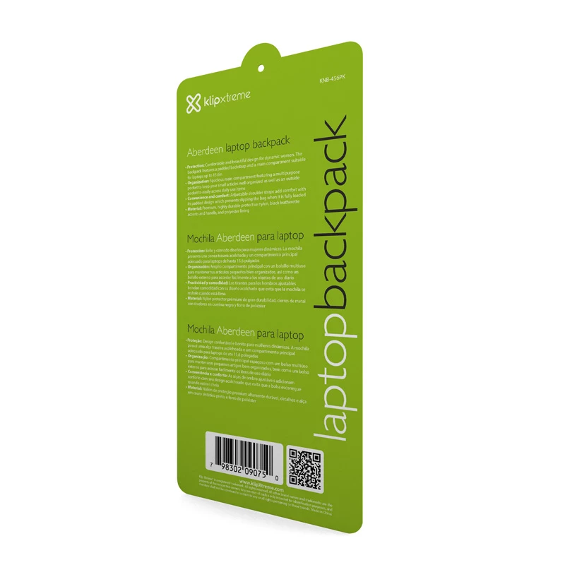Klip Xtreme Aberdeen. Tipo de carcasa: Mochila, Tamaño máximo de pantalla: 39.6 cm (15.6"), Número de bolsillos frontales: 1, Asa de transporte. Peso: 530 g. Coloración de superficie: Monocromático