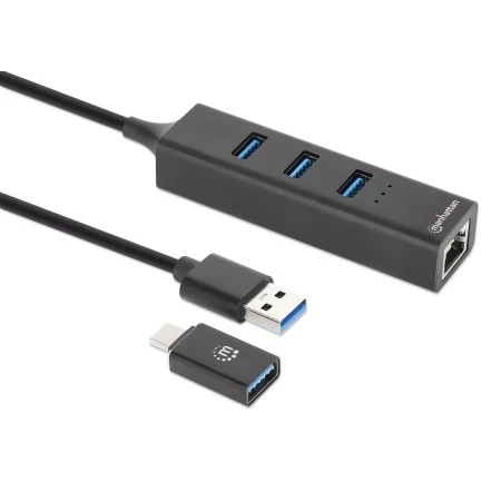 Manhattan 180894. Interfaz de host: USB 3.2 Gen 1 (3.1 Gen 1) Type-A + Type-C, Interfaces de concentradores: RJ-45, USB 3.2 Gen 1 (3.1 Gen 1) Type-A. Velocidad de transferencia de datos: 5000 Mbit/s, Color del producto: Negro, Material de la cubierta: Aluminio. Tipo de interfaz ethernet: Ethernet rápido, Gigabit Ethernet, Ethernet LAN, velocidad de transferencia de datos: 10,100,1000 Mbit/s, Estándares de red: IEEE 802.1Q, IEEE 802.1p, IEEE 802.3, IEEE 802.3ab, IEEE 802.3az, IEEE 802.3u. Sistemas operativos Windows soportados: Windows 10, Windows 11, Windows 7, Windows 8.1, Windows Vista, Windows XP, Otros sistemas operativos soportados: ChromeOS. Ancho: 25 mm, Profundidad: 90 mm, Altura: 19 mm