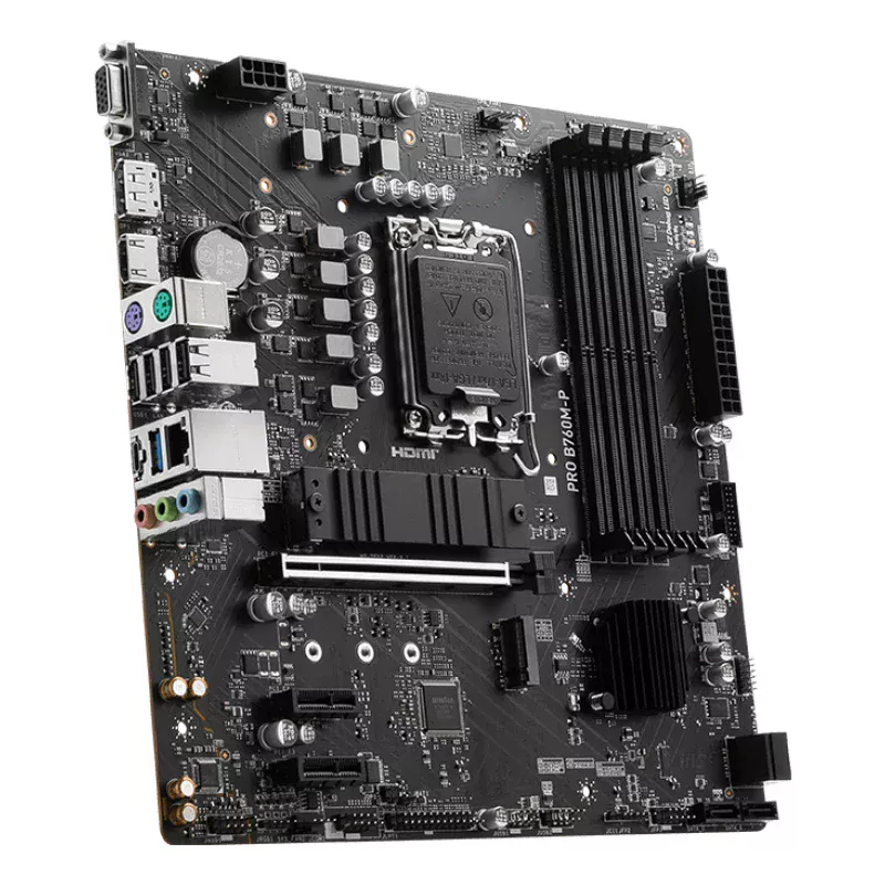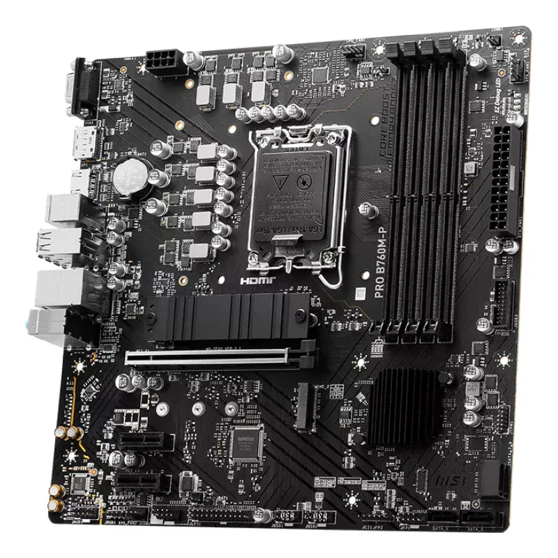 MSI PRO B760M-P. Fabricante de procesador: Intel, Socket de procesador: LGA 1700, Procesador compatible: Intel® Celeron®, Intel® Pentium® Gold. tipos de memoria compatibles: DDR5-SDRAM, Memoria interna máxima: 192 GB, ECC сompatibility: No-ECC. Interfaces de disco de almacenamiento soportados: SATA III, Tipos de unidades de almacenamiento admitidas: HDD & SSD, Niveles RAID: 0, 1, 5, 10. Tipo de interfaz ethernet: Gigabit Ethernet, Controlador LAN: Realtek RTL8111H. Componente para: PC, Factor de forma de la tarjeta madre: Micro ATX, Familia del chipset: Intel