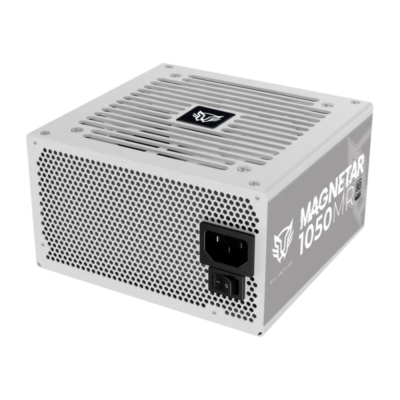 Balam Rush Magnetar 1050MR. Potencia total: 1050 W, Corrección del factor de potencia tipo (PFC): Activo, Corriente máxima de salida (+3.3V): 20 A. Alimentador de energía para tarjeta madre: 24-pines ATX, Tipo de cableado: Totalmente modular. Utilizar con: PC, Factor de forma de fuente de alimentación (PSU): ATX, Certificación 80 PLUS: 80 PLUS Platinum. Color del producto: Blanco, Tipo de enfriamiento: Activo, Diámetro de ventilador: 12 cm. Ancho: 140 mm, Profundidad: 150 mm, Altura: 86 mm