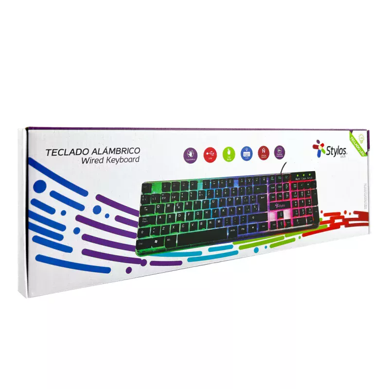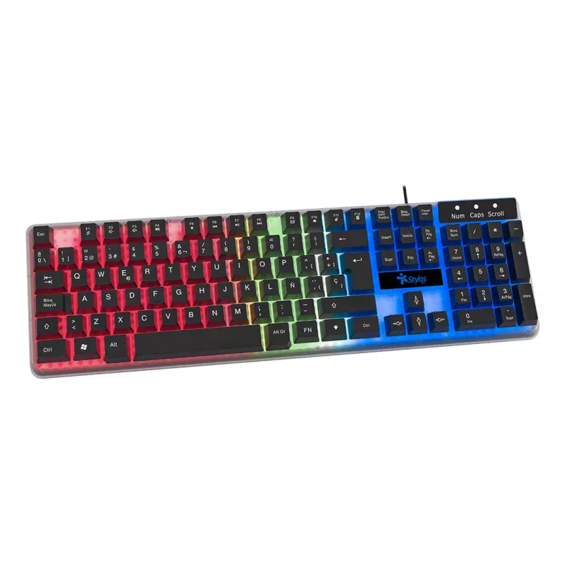 Stylos STTEALLED1T. Formato del teclado: Tamaño completo (100%), Tecnología de conectividad: Alámbrico, Interfaz del dispositivo: USB, Interruptor del teclado: Interruptor de membrana, Teclado, cantidad de teclas: 105. Tipo de retroiluminación: LED. Longitud de cable: 1.4 m. Uso recomendado: Juego. Color del producto: Transparente