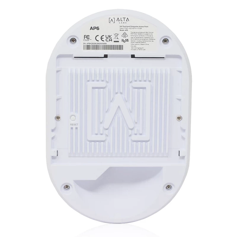 Alta Labs AP6. 2.4 GHz, 5 GHz, Rango máximo de transferencia de datos: 3000 Mbit/s. Algoritmos de seguridad: WPA-Enterprise, WPA-PSK, WPA2, WPA3. Ethernet LAN, velocidad de transferencia de datos: 100,1000 Mbit/s. Energía sobre Ethernet (PoE). Color del producto: Blanco. Consumo de energía (máx.): 20 W