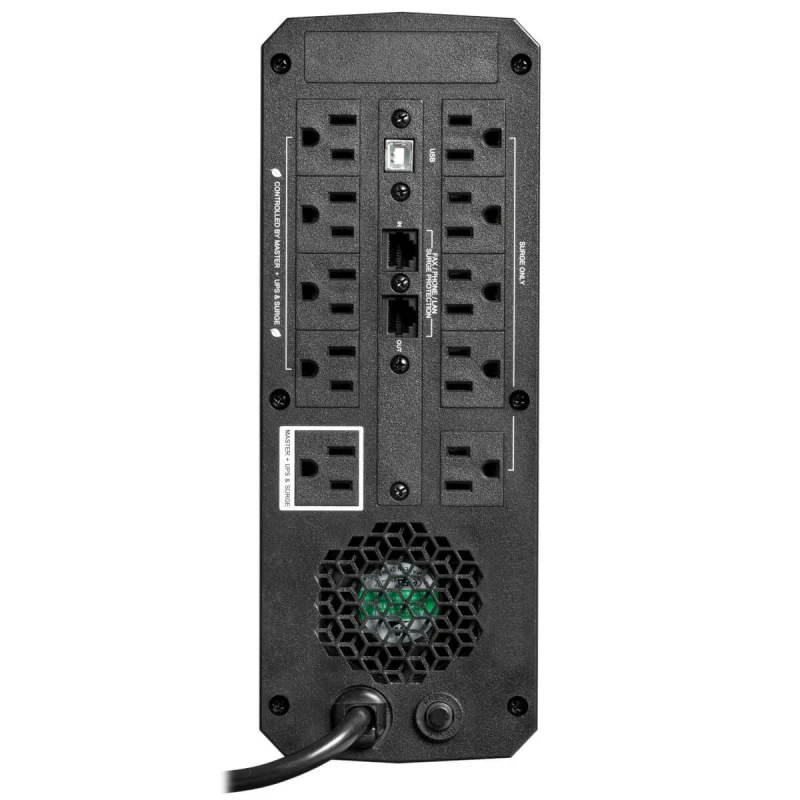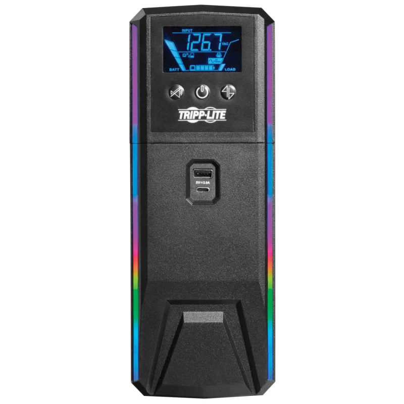 Tripp Lite SMART1200PSGLCD Respaldo por Batería del UPS para Juegos con Onda Sinusoidal Pura de 1200VA 720W 120V - LCD, AVR, LEDs RGB, Carga USB, Ahorrador de Energía. Topología UPS: Línea interactiva, Capacidad de potencia de salida (VA): 1.2 kVA, Potencia de salida: 720 W. Tipo de salida AC: NEMA 5-15R, Conector: NEMA 5-15P, Cantidad de salidas AC: 10 salidas AC. Tecnología de batería: Sealed Lead Acid (VRLA), Tiempo típico de respaldo a carga completa: 2.5 min, Tiempo típico de respaldo a media carga: 9 min. Factor de forma: Tower, Color del producto: Negro, Material de la cubierta: Acrilonitrilo butadieno estireno (ABS). Certificados de cumplimiento: Comisión Federal de Comunicaciones (FCC)