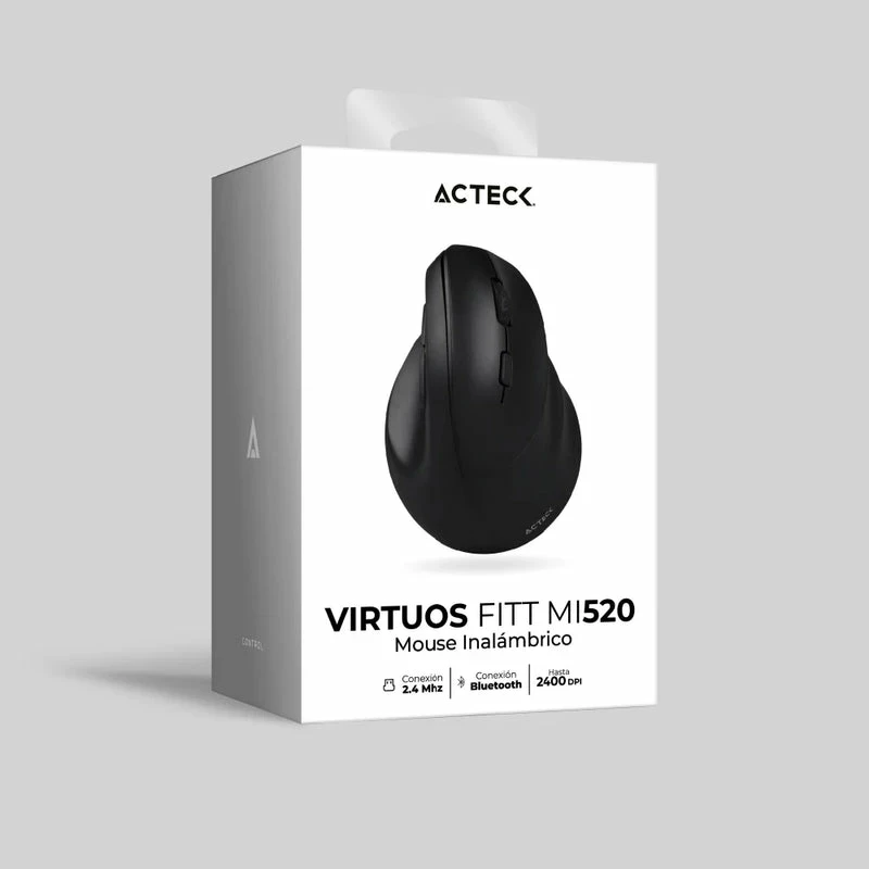 Acteck VIRTUOS FITT MI520. Factor de forma: Diestro, Diseño vertical. Tecnología de detección de movimientos: Óptico, Interfaz del dispositivo: RF inalámbrico + bluetooth, Resolución de movimiento: 2400 DPI, Tipo de botones: Botones presionados, Cantidad de botones: 7, Tipo de desplazamiento: Rueda. Fuente de energía: Baterías/Cable. Color del producto: Negro