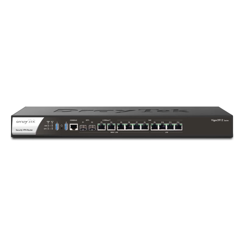 DrayTek Vigor3912. Tipo de interruptor: Gestionado. Puertos tipo básico de conmutación RJ-45 Ethernet: 10G Ethernet (100/1000/10000), Cantidad de puertos básicos de conmutación RJ-45 Ethernet: 12, Puerto de consola: RJ-45. Bidireccional completo (Full duplex), Estándares de red: IEEE 802.1Q, IEEE 802.1p. Montaje de pared, Montaje en rack, Factor de forma: 1U