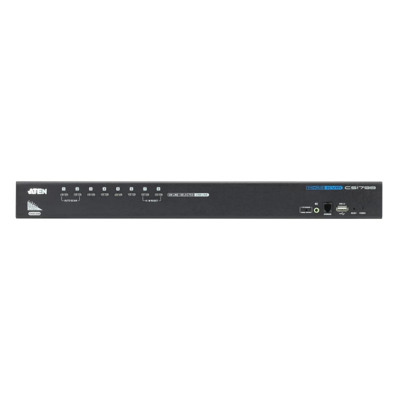 ATEN CS1798. Tipo de puerto de teclado: USB, Tipo de puerto de ratón: USB, Tipo de puerto de vídeo: HDMI. Tipo HD: WUXGA, Máxima resolución: 1920 x 1200 Pixeles, Ancho de banda de vídeo: 60 Hz. Color del producto: Negro, Capacidad del rack: 1U, Material de la cubierta: Metal. Fuente de energía: CC, Voltaje de entrada: 5 V, Consumo energético: 12 W. Ancho: 432.4 mm, Profundidad: 257.2 mm, Altura: 44 mm