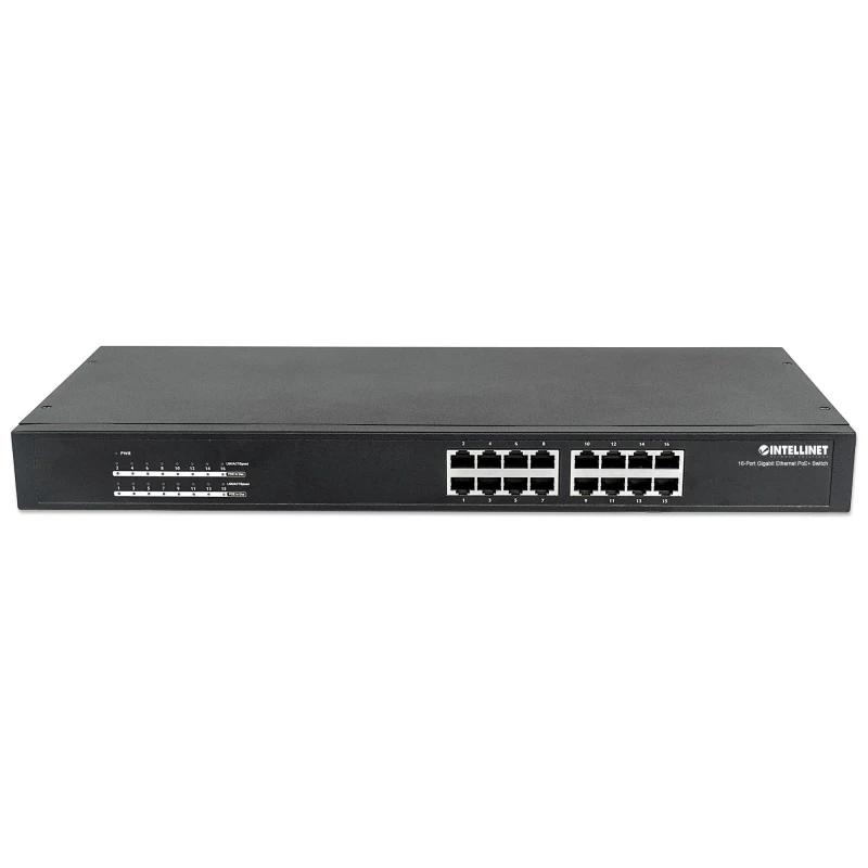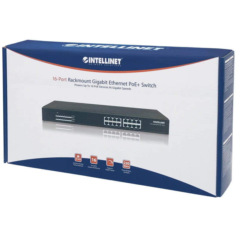 Intellinet 560993. Tipo de interruptor: No administrado, Capa del interruptor: L2. Puertos tipo básico de conmutación RJ-45 Ethernet: Gigabit Ethernet (10/100/1000), Cantidad de puertos básicos de conmutación RJ-45 Ethernet: 16. Bidireccional completo (Full duplex). Tabla de direcciones MAC: 8192 entradas, Capacidad de conmutación: 32 Gbit/s. Estándares de red: IEEE 802.3, IEEE 802.3ab, IEEE 802.3af, IEEE 802.3at, IEEE 802.3u, IEEE 802.3x. Energía sobre Ethernet (PoE). Montaje en rack, Factor de forma: 1U