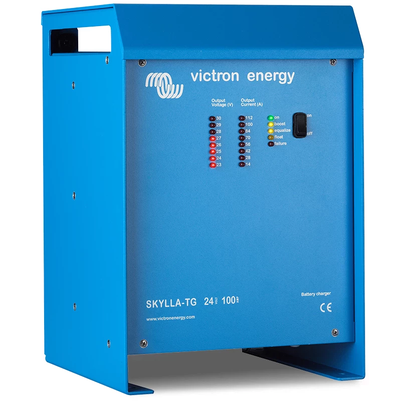 Victron Energy Skylla 24/100. Tipo de alimentación: Corriente alterna, CC. Color del producto: Azul, Material de la cubierta: Aluminio, Indicadores LED: Carga. Voltaje de entrada: 90 - 265 V, Frecuencia de entrada: 45 - 65 Hz, La tensión de carga: 28.5 V. Ancho: 250 mm, Profundidad: 257 mm, Altura: 365 mm. Cantidad por paquete: 1 pieza(s)