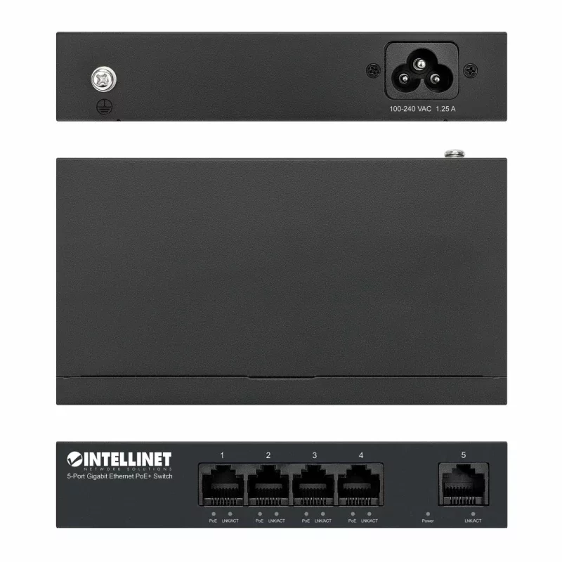 Intellinet 561792. Puertos tipo básico de conmutación RJ-45 Ethernet: Gigabit Ethernet (10/100/1000), Cantidad de puertos básicos de conmutación RJ-45 Ethernet: 5. Bidireccional completo (Full duplex). Tabla de direcciones MAC: 2000 entradas, Capacidad de conmutación: 10 Gbit/s. Estándares de red: IEEE 802.3, IEEE 802.3ab, IEEE 802.3af, IEEE 802.3at, IEEE 802.3u, IEEE 802.3x. Energía sobre Ethernet (PoE). Montaje de pared