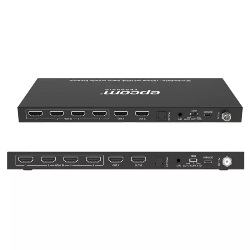 Epcom EPC-MXB42A. Tipo de puerto de vídeo: HDMI. Materiales: Metal, Color del producto: Negro, Ancho de banda: 18 Gbit/s. Voltaje de entrada AC: 100 - 240 V, Frecuencia de adaptador AC: 50/60 Hz, Consumo de energía (máx.): 3.8 W. Ancho: 251 mm, Profundidad: 105 mm, Altura: 20 mm