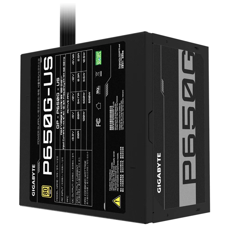 GIGABYTE GP-P650G-US. Potencia total: 650 W, Voltaje de entrada AC: 100 - 240 V, Corriente de entrada: 12 - 6 A. Alimentador de energía para tarjeta madre: 20+4 pin ATX, Longitud del cable de alimentación de la placa base: 50 cm, Longitud del cable de alimentación SATA: 150,500 mm. Utilizar con: PC, Factor de forma de fuente de alimentación (PSU): ATX, Certificación 80 PLUS: 80 PLUS Bronze. Color del producto: Negro, Tipo de enfriamiento: Activo, Diámetro de ventilador: 12 cm. Ancho: 140 mm, Profundidad: 150 mm, Altura: 86 mm