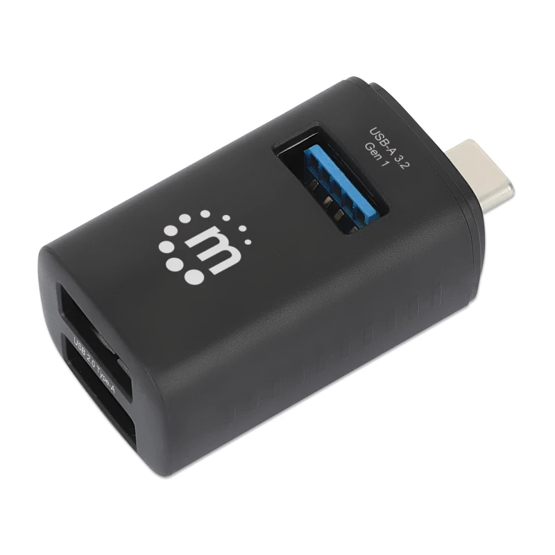 Manhattan 180993. Interfaz de host: USB 3.2 Gen 1 (3.1 Gen 1) Type-C, Interfaces de concentradores: USB 2.0 Type-A, USB 3.2 Gen 1 (3.1 Gen 1) Type-A. Velocidad de transferencia de datos: 5000 Mbit/s, Color del producto: Negro, Material de la cubierta: Acrilonitrilo butadieno estireno (ABS). Tipo de fuente de alimentación: USB, Voltaje de salida: 5 V, Corriente de salida: 0.9 A. Sistemas operativos Windows soportados: Windows 10, Windows 11, Windows 7, Windows 8, Otros sistemas operativos soportados: ChromeOS. Ancho: 24 mm, Profundidad: 55 mm, Altura: 20 mm