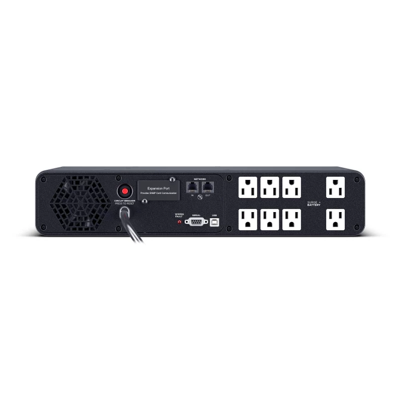 CyberPower CP1500PFCRM2U. Topología UPS: Línea interactiva, Capacidad de potencia de salida (VA): 1.5 kVA, Potencia de salida: 1000 W. Tipo de salida AC: NEMA 5–15R, Conector: NEMA 5-15P, Cantidad de salidas AC: 8 salidas AC. Tecnología de batería: Sealed Lead Acid (VRLA), Capacidad de la batería: 9 Ah, Voltaje de la pila: 12 V. Factor de forma: Montaje en rack o Montaje en bastidor, Color del producto: Negro, Material de la cubierta: Plástico. Certificados de cumplimiento: RoHS