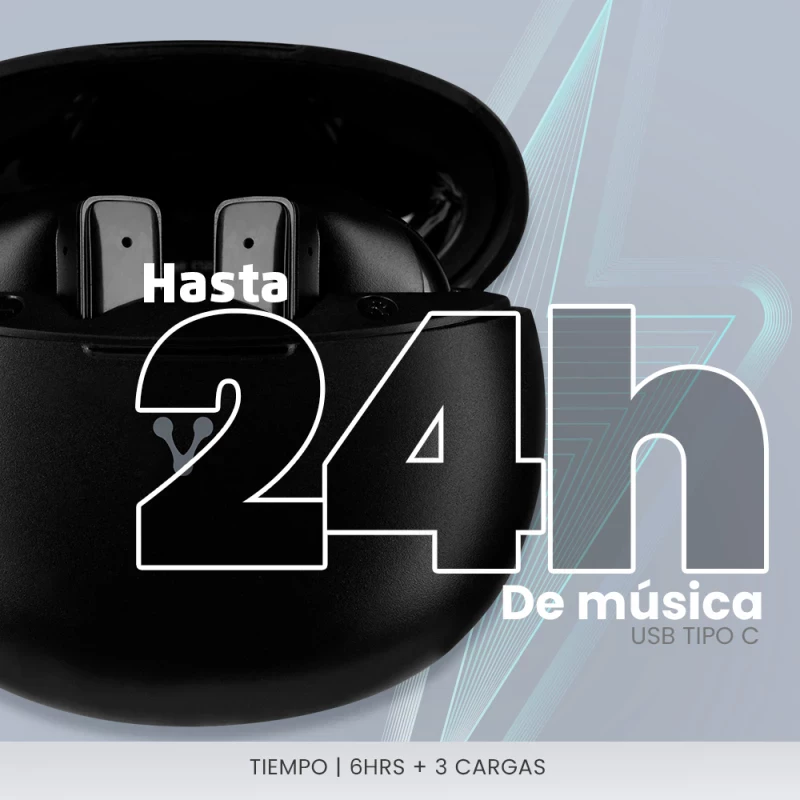 El estuche de carga, equipado con puerto USB tipo C, no solo protege tus audífonos cuando no están en uso, sino que también ofrece hasta tres cargas adicionales a las seis horas continuas de reproducción que ofrecen, extendiendo la duración total de la batería hasta 24 horas.
