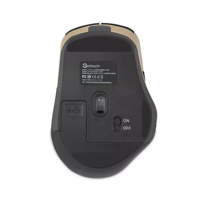 Getttech GGM-STDBW-01-GD. Factor de forma: Diestro. Interfaz del dispositivo: RF inalámbrico + bluetooth, Resolución de movimiento: 7200 DPI, Cantidad de botones: 6, Tipo de desplazamiento: Rueda. Fuente de energía: Baterías. Color del producto: Negro, Oro