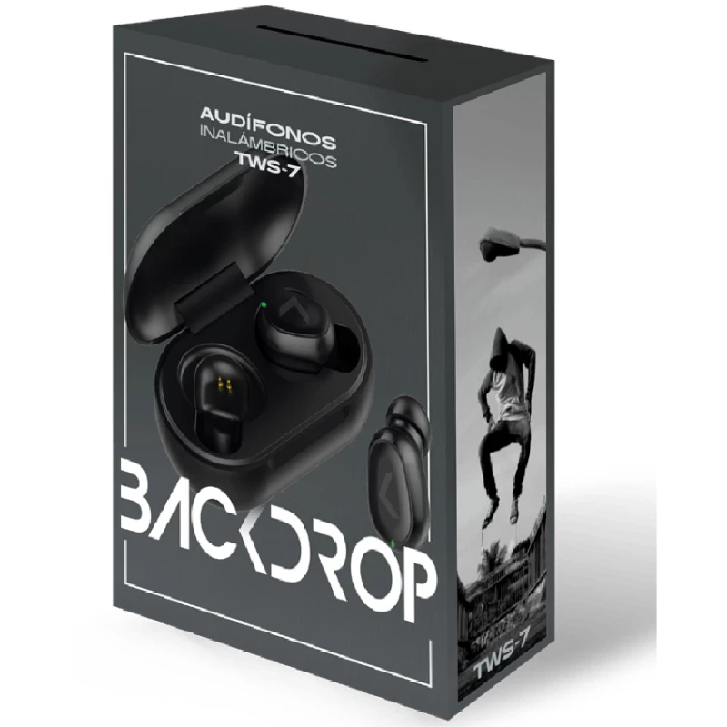 BACKDROP TWS-7. Tipo de producto: Audífonos. Tecnología de conectividad: True Wireless Stereo (TWS), Bluetooth. Uso recomendado: Música. Alcance inalámbrico: 10 m. Color del producto: Negro