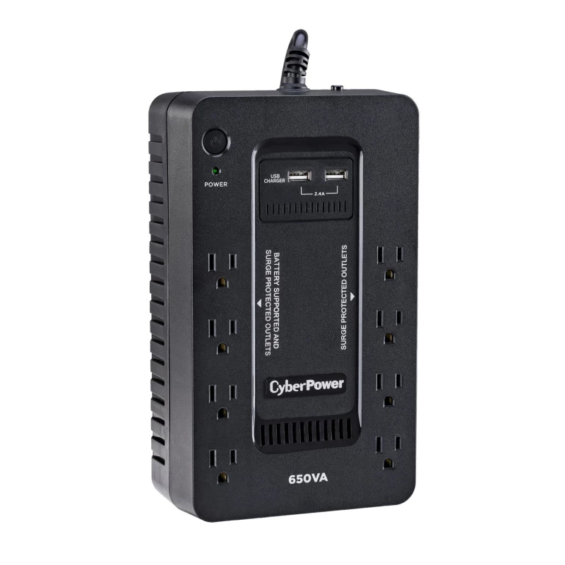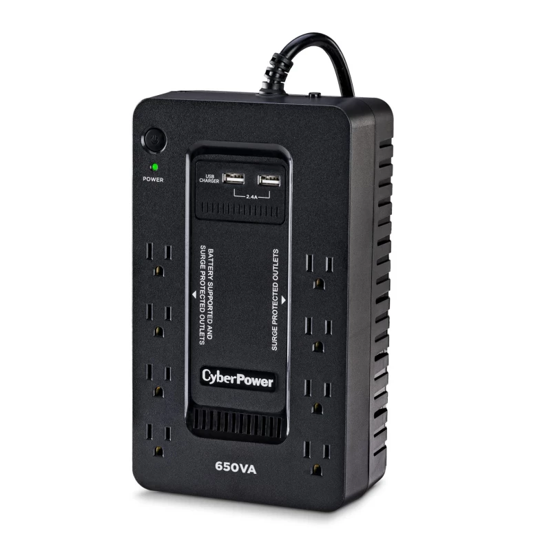 CyberPower SX650U. Topología UPS: En espera (Fuera de línea), Capacidad de potencia de salida (VA): 650 kVA, Potencia de salida: 360 W. Tipo de salida AC: NEMA 5–15R, Conector: NEMA 5-15P, Cantidad de salidas AC: 8 salidas AC. Tecnología de batería: Sealed Lead Acid (VRLA), Capacidad de la batería: 5.5 Ah, Voltaje de la pila: 12 V. Factor de forma: Compacto, Color del producto: Negro