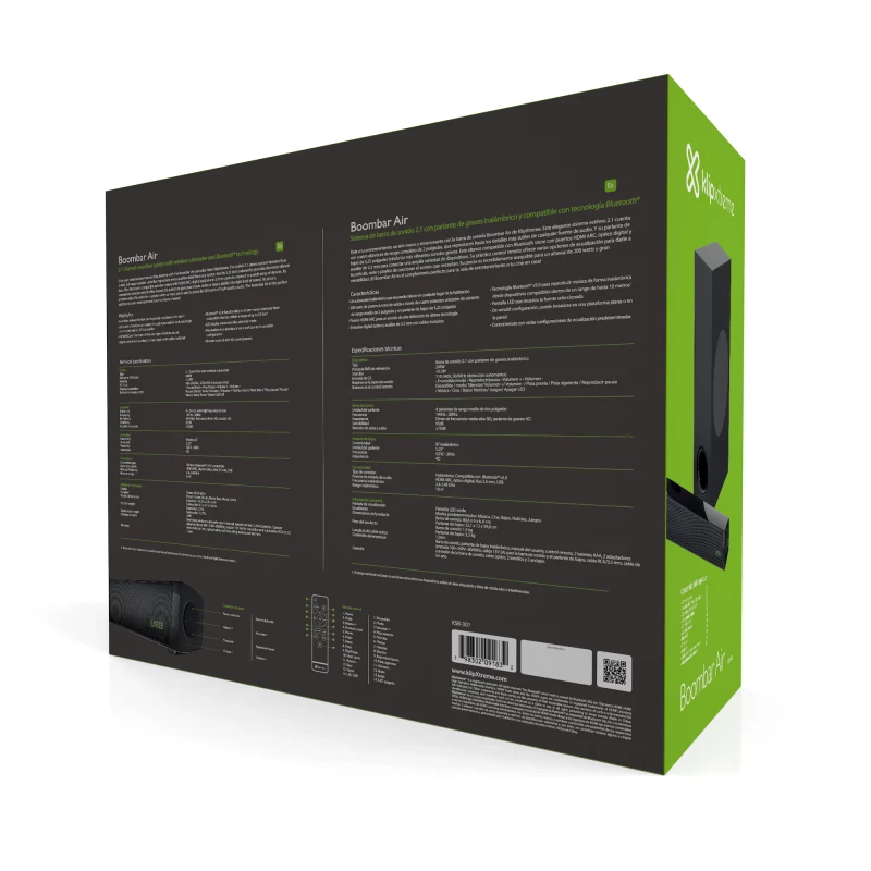 Klip Xtreme BoomBar Air. Canales de salida de audio: 2.1 canales, Potencia estimada RMS: 200 W, Modos de ecualización: Bajo, Juego, Película, Música. Potencia de la barra de sonido del altavoz RMS: 200 W, Impedancia: 8 Ohmio, Relación señal/ruido (SNR): 75 Db. Tipo de subwoofer: Altavoz de subgraves (subwoofer) activo, Rango de frecuencias de subwoofer: 52 - 3000 Hz, Impedancia de subwoofer: 4 Ohmio. Color del producto: Negro, Tipo de visualizador: LED. Tecnología de conectividad: Inalámbrico