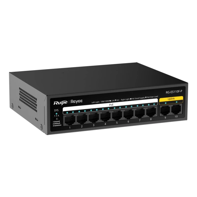 Ruijie Networks RG-ES110F-P. Tipo de interruptor: No administrado. Puertos tipo básico de conmutación RJ-45 Ethernet: Fast Ethernet (10/100), Cantidad de puertos básicos de conmutación RJ-45 Ethernet: 10. Bidireccional completo (Full duplex). Tabla de direcciones MAC: 8000 entradas, Capacidad de conmutación: 2 Gbit/s. Energía sobre Ethernet (PoE)