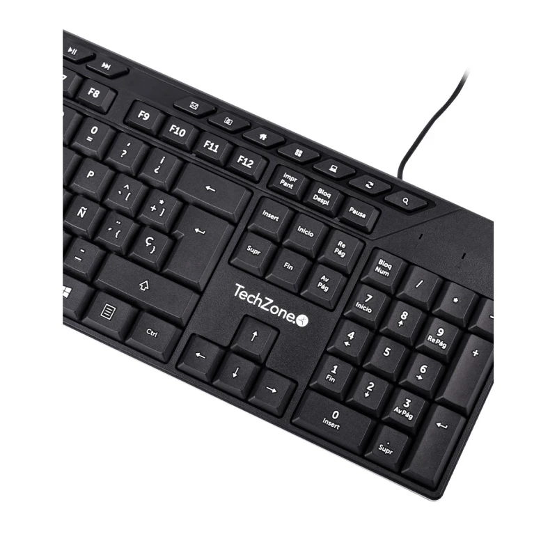 TechZone TZACCBA01. Formato del teclado: Tamaño completo (100%), Tecnología de conectividad: Alámbrico, Interfaz del dispositivo: USB, Diseño de teclado: QWERTY, Teclado, cantidad de teclas: 120. Longitud de cable: 1.31 m. Uso recomendado: Oficina. Color del producto: Negro. Ratón incluido