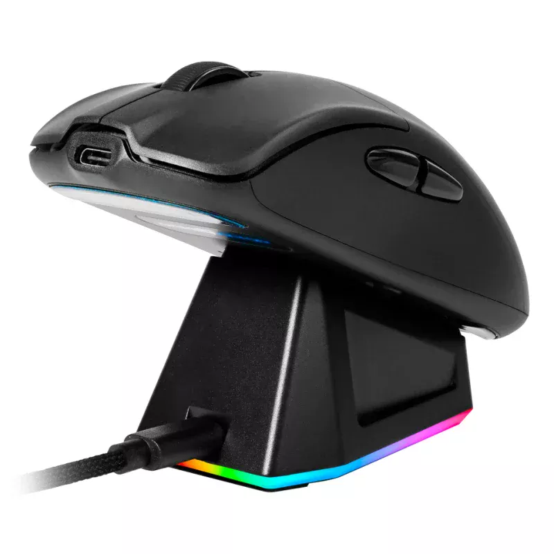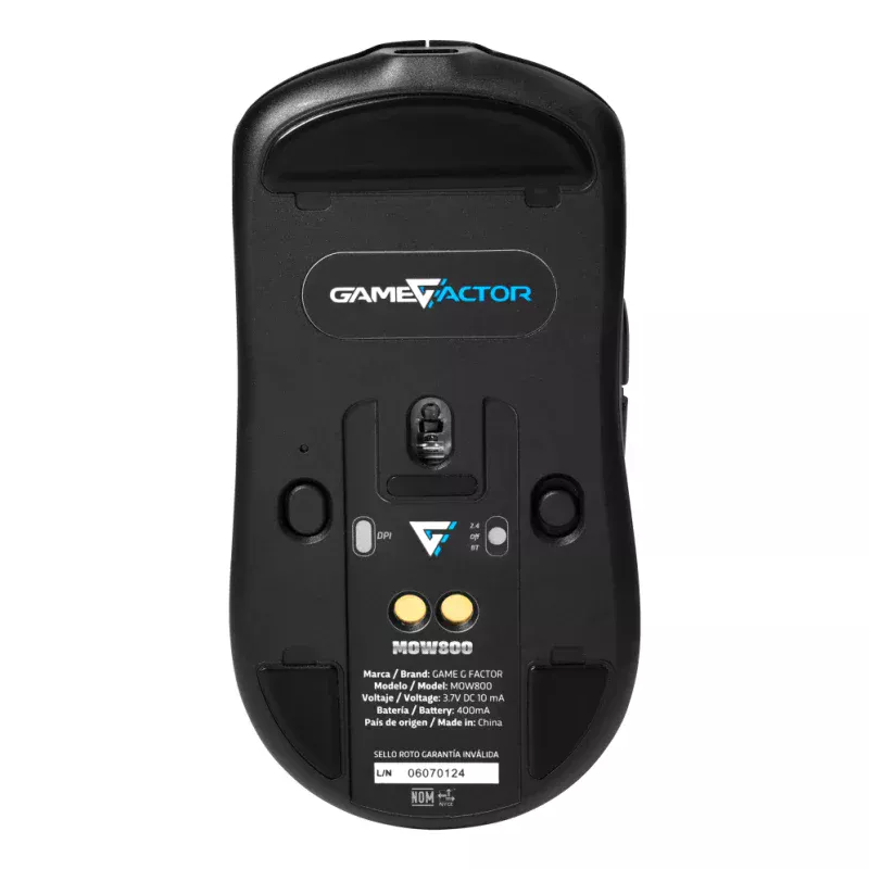 Game Factor MOW800. Factor de forma: Ambidiestro. Interfaz del dispositivo: RF Wireless + Bluetooth + USB Type-A, Resolución de movimiento: 26000 DPI, Tipo de desplazamiento: Rueda. Iluminación de color: Multi. Fuente de energía: Baterías. Color del producto: Negro