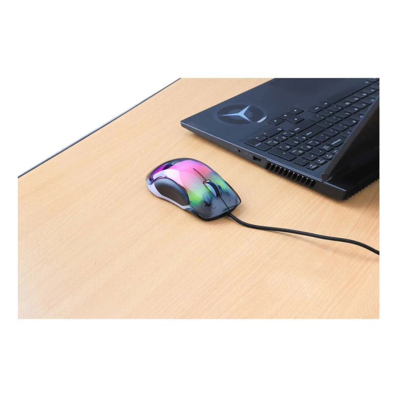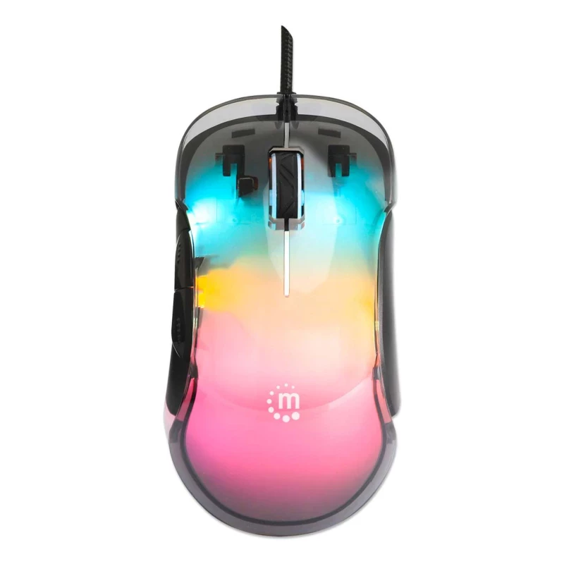 Manhattan 190381. Factor de forma: Ambidiestro. Tecnología de detección de movimientos: Óptico, Interfaz del dispositivo: USB tipo A, Resolución de movimiento: 12800 DPI, Tipo de botones: Botones presionados, Cantidad de botones: 5, Tipo de desplazamiento: Rueda. Iluminación de color: Multi. Fuente de energía: Cable. Color del producto: Transparente