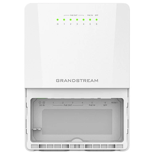Grandstream Networks GWN7710R. Tipo de interruptor: Gestionado, Capa del interruptor: L2. Puertos tipo básico de conmutación RJ-45 Ethernet: Gigabit Ethernet (10/100/1000), Cantidad de puertos básicos de conmutación RJ-45 Ethernet: 5. Tabla de direcciones MAC: 2000 entradas, Capacidad de conmutación: 10 Gbit/s. Estándares de red: IEEE 802.11a, IEEE 802.11ac, IEEE 802.11ax, IEEE 802.11b, IEEE 802.11g, IEEE 802.11n. Voltaje de entrada DC: 12 - 57 V. Energía sobre Ethernet (PoE)