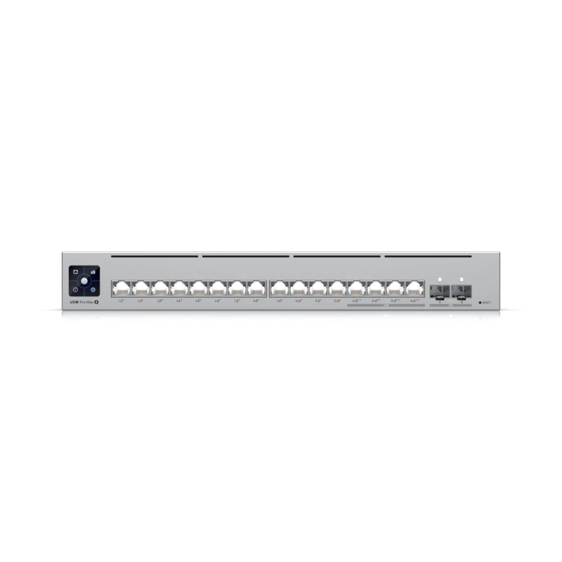 Ubiquiti Pro Max 16 PoE. Tipo de interruptor: Gestionado, Capa del interruptor: L3. Puertos tipo básico de conmutación RJ-45 Ethernet: Gigabit Ethernet (10/100/1000), Cantidad de puertos básicos de conmutación RJ-45 Ethernet: 16. Capacidad de conmutación: 84 Gbit/s. Estándares de red: IEEE 802.1x. Voltaje de entrada DC: 44 - 57 V. Conector eléctrico: Toma de entrada de CC. Energía sobre Ethernet (PoE). Montaje en rack