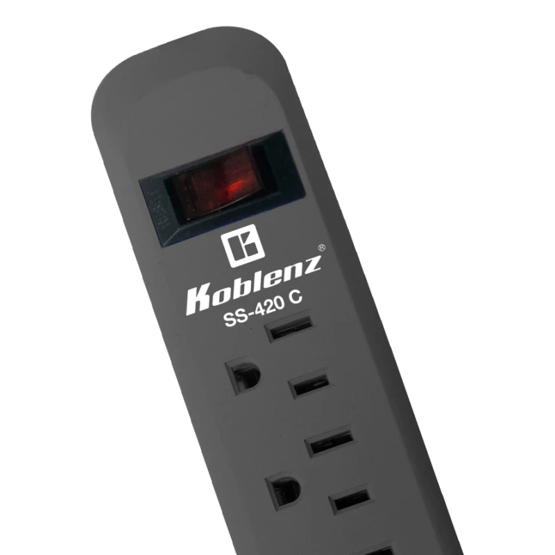 Koblenz SS-420-C. Índice de aumento de energía: 420 J, Cantidad de salidas AC: 6 salidas AC, Corriente nominal de salida: 10 A. Color del producto: Gris Oscuro. Longitud de cable: 0.45 m, Peso: 280 g, Ancho: 95 mm. Ancho del paquete: 115 mm, Largo del paquete: 55 mm, Alto del paquete: 330 mm