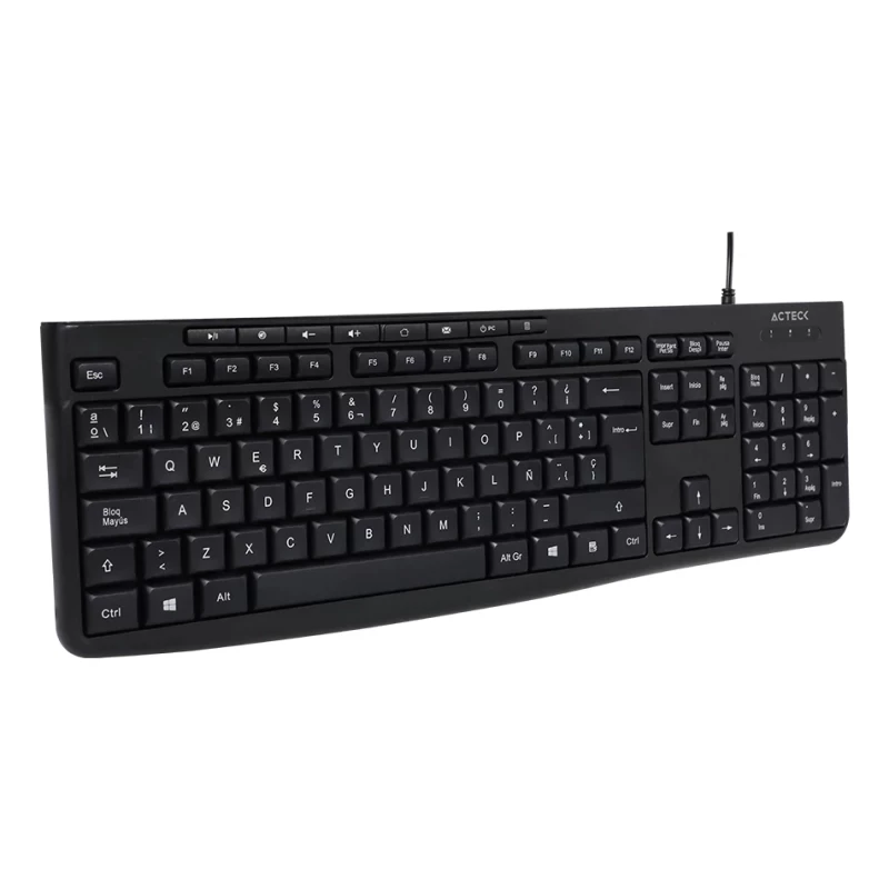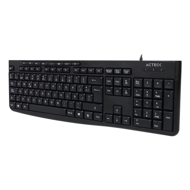 Acteck Inspire Prime TA222. Formato del teclado: Tamaño completo (100%), Tecnología de conectividad: Alámbrico, Interfaz del dispositivo: USB, Interruptor del teclado: Interruptor de membrana, Diseño de teclado: QWERTY, Teclado, cantidad de teclas: 112. Longitud de cable: 1.5 m. Uso recomendado: Hogar / Oficina. Color del producto: Negro