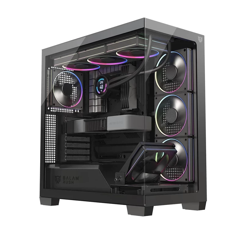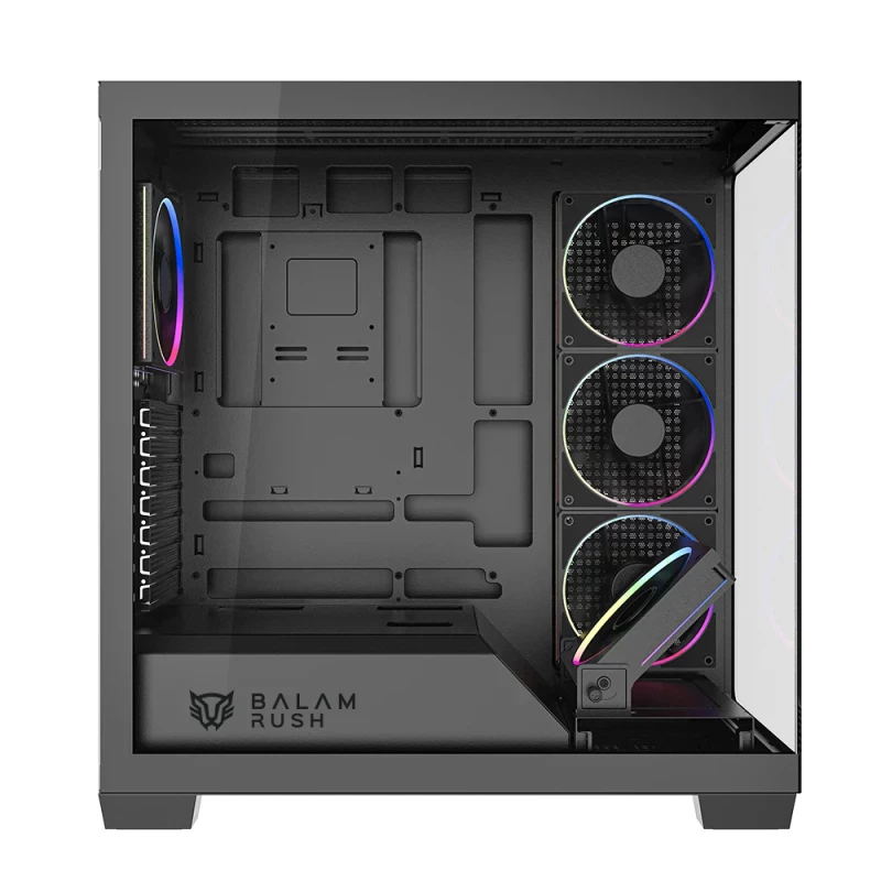 Balam Rush Tank Polar 7900. Factor de forma: Midi Tower, Tipo: PC, Color del producto: Negro. Diámetro de ventiladores frontales soportados: 120 mm, Ventiladores laterales instalados: 3x 120 mm, Diámetro de ventiladores secundarios soportados: 120 mm. Tamaños de disco duro soportados: 2.5,3.5". Ancho: 235 mm, Profundidad: 445 mm, Altura: 472 mm. Ancho del paquete: 517 mm, Largo del paquete: 308 mm, Alto del paquete: 525 mm