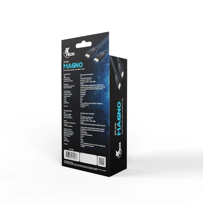 Xtech XTC-636. Longitud de cable: 1.8 m, Conector 1: HDMI Tipo A (Estándar), Género del conector 1: Macho, Conector 2: HDMI Tipo A (Estándar), Género del conector 2: Macho, Contactos del conector chapado: Oro, Versión HDMI: 2.1, 3D, Velocidad de transferencia de datos: 48 Gbit/s, Canal de retorno de audio (ARC), Color del producto: Negro
